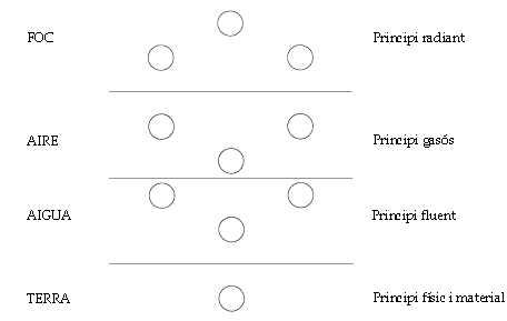 Els Quatre Elements (2). Els quatre elements, o millor, els quatre principis que ells simbolitzen (que constitueixen qualsevol possibilitat de manifestació i per tant, la de tota matèria, donat que aquesta és la combinació d'aquests principis o elements en rotació, alternant-se els uns amb els altres; els quals no són més que l'emanació d'un mateix principi creador universal que pren diferents maneres o formes designades per diferents noms) s'anomenen, com ja sap l'estudiant d'aquesta Introducció a la Ciència Sagrada, foc, aire, aigua i terra. El foc simbolitza el principi radiant que és el més alt de tots. En l'Arbre de la Vida correspondria a Atsiluth, a allò ontològic, o sigui a l'Ésser, i a l'Esperit. És la primera possibilitat de la matèria, l'hàlit espermàtic del sofre capaç de fecundar la potència mercurial, la penetració per la paraula, o sigui la llum pura simbolitzada per aquest principi radiant, materialitzat en allò que significa l'igni, del qual el foc n'és l'emblema. El següent element, o estat de la matèria, és l'aire o energia gasosa i subtil, corresponent a la levitat i inestabilitat del que és emocional, al pla de Beriyah, a la primera construcció d'allò cosmogònic, a la sublimació del que és fluent, a la transmissió de tota possibilitat, al buf de l'aire com a causant de la generositat de les pluges i la generació vegetal, i també a l'ànima superior, la qual està per damunt de la superfície de les aigües. El tercer element és l'aigua, gas condensat, o energia fluent, capaç, com ja s'ha dit, de generar, però també de corroir. Tota matèria és estovada per l'aigua, que igualment sempre troba una llera i que és capaç d'adaptar-se a la forma que li toqui. Correspon al pla de Yetsirah i al perillós i atractiu psiquisme inferior; a les belles i a les arts. També, a una condensació del que és aeri i per tant a una progressiva solidificació, a una transformació d'aquell principi radiant, d'aquella primera emanació que es va expressar per un buf que ara, en coagular-se, es presenta en estat líquid. L'últim element és la terra, que és el receptacle i alhora conté en el seu si els restants principis, elements, o estats de la matèria, i és l'energia solidificada d'aquesta matèria, el summum de la seva densitat i de les seves possibilitats de concreció. Correspon al pla d'Asiyah, a la gran mare, a la potència de l'acte permanent, al que és passiu en continu moviment, a la última manifestació de la perfecció universal, mirall de la perfecció del seu creador.
